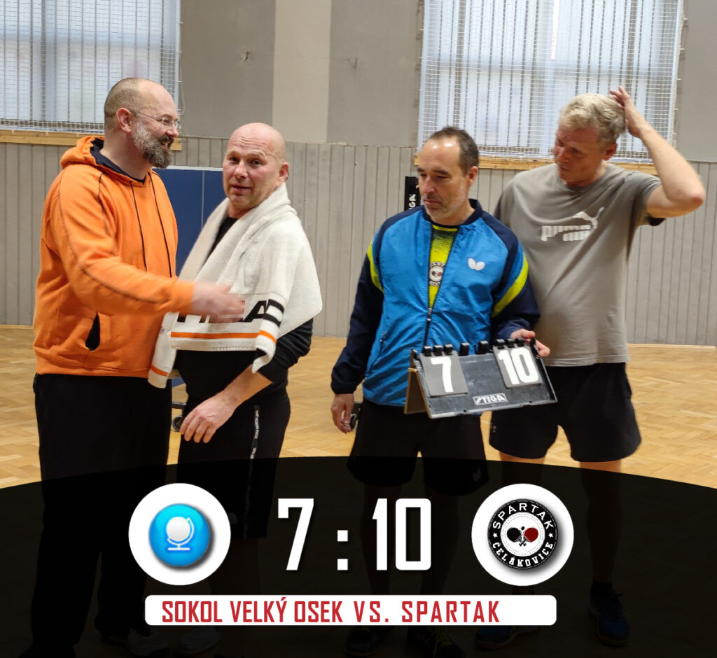 Dohráno. Že to dnes nebude procházka růžovým sadem napověděly čtyřhry. Zatimco Petr s Jiříkem si dokráčeli za pohodovým vítězstvím, tak Matěj s Cipísem vypadali jak dva důchodci, co si ráno pomíchali prášky. Trefit balón byl nad jejich síly a o pohybu ani nemluvě. Bohužel si ten lehký drogový rauš přenesli i do prvních dvouher. Matěj dostal naloženo od výborně hrající Stránské, Cipíse smetl mladý Buriánek a aby v tom nebyli sami, tak se k nim v prvním kole přidal Jiřík. Ten pro změnu dostal naloženo od veterána a bývalého hráče Spartaku Josefa Jindry. Po prvních 3 dvouhrách na nás zývalo skóre 1:4. Naštěstí máme Petra, který zavelel k obratu. S přehledem si poradil s mladým Cincibusem a snížil na již přijatelných 2:4. Zvedlý prapor pak už držel i Matěj a spolu s Petrem přidávali jeden bodík za druhým. Klíčový duel sehrál Jiřík proti Stránské, kdy v koncovce čtvrtého setu zahrál pár excelentních balónků a celý zápas pak vyhrál 3:1. Stav 9:7 pro Spartak. Na poslední zápasy se staví Cipís a Petr. Cipís, do té doby hrající v téžké sádře našel poslední zbytky hlavně morálních sil a v infarktovém pětiseťáku doslova a do písmene přetlačil Pepu Jindru. Dohráno. Dobojováno. První opravdová zatěžkávací zkouška našeho mužstva je za námi. Spartak poráží Velký Osefk